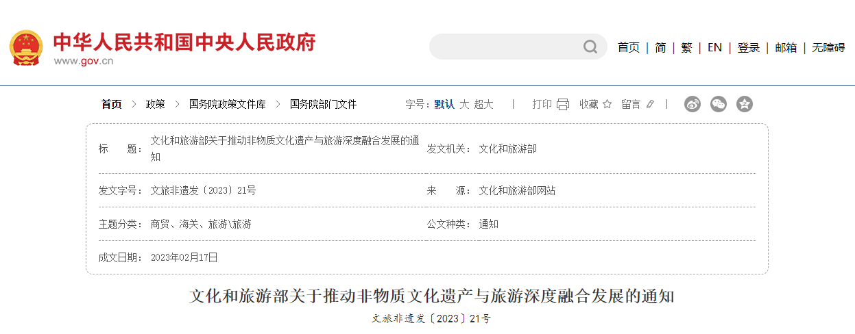 为深入贯彻落实党的二十大精神和习近平总书记关于非物质文化遗产保护工作的重要指示精神,落实中共中央办公厅、国务院办公厅印发的《关于进一步加强非物质文化遗产保护工作的意见》以及《“十四五”旅游业发展规划》《“十四五”非物质文化遗产保护规划》要求,现就推动非物质文化遗产与旅游深度融合发展工作事项通知如下: