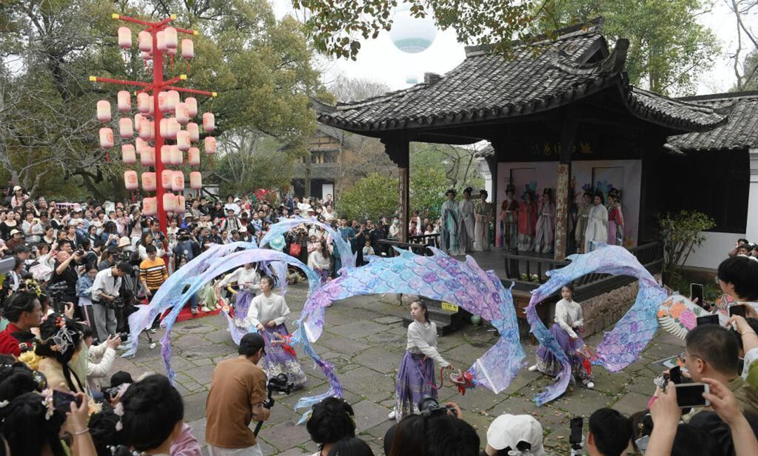 游客在杭州西溪湿地深潭口古戏台观看花朝节表演。 新华社 供图