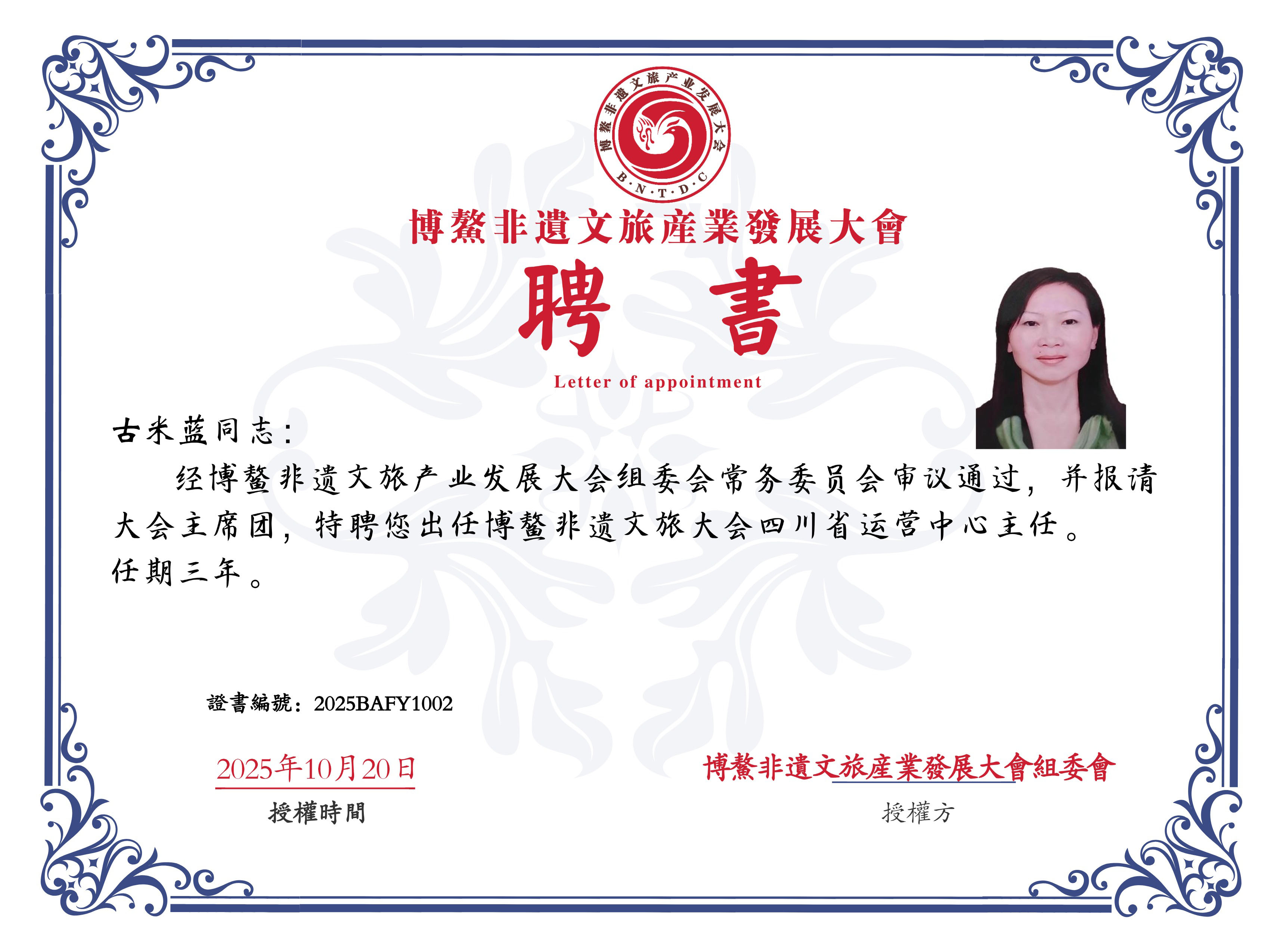 荣誉聘书 古米蓝同志 作者: 博鳌非遗组委会 时间: 2025-10-30 09:31 阅读: 2582 次 字体大小: 小 中 大 点赞 (0) 分享 微博 QQ 微信 扫码分享 下一篇 → 王文江同志